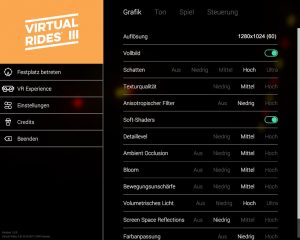 Nach der Installation, Steam ist auch bei der Box-Version aus dem Handel notwendig, geht es direkt rein in das Getümmel. Tatsächlich landet man direkt im Spiel. Zuvor können noch diverse Grafik- und Soundeinstellungen vorgenommen werden. So lässt sich Virtual Rides 3 auch auf älteren PCs recht ruckelfrei spielen, indem man einfach alle Effekte ausstellt. Der Nebeneffekt: Es sieht aus wie aus dem Jahr 2000.