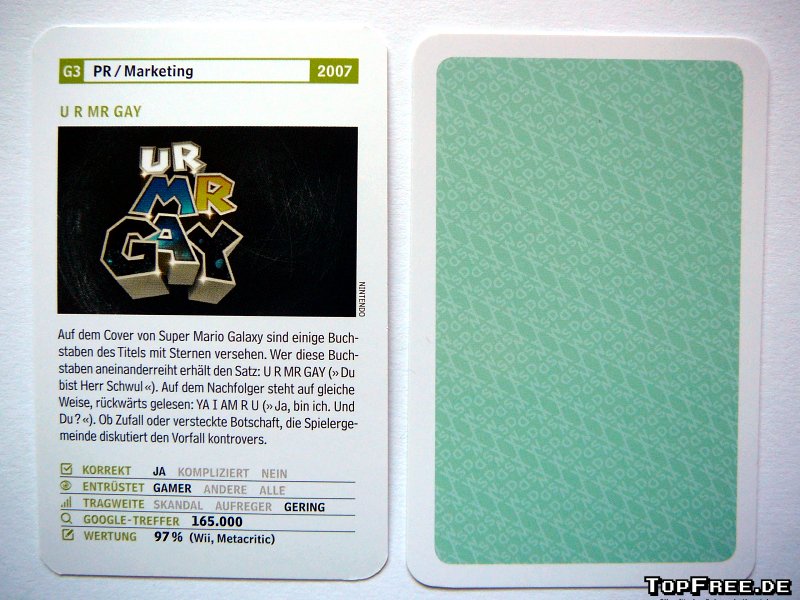 Die acht Kategorien, mit je vier Karten, sind in Story / Wirkung, Religion, Sexismus, Rassismus, Technik / Hardware, PR / Marketing, Wirtschaft / Medien und Gewalt aufgeteilt. Neben der Überschrift, dem Bild und einem Mini-Artikel gibt es fünf Bereiche für das Supertrumpf-Spiel – das erste, auch Autoquartett, genannt erschien 1952 von der deutschen Firma ASS. Korrekt, Entrüstet, Tragweite, Google-Treffer und Wertung entscheiden über Sieg oder Niederlage. Mit Zahlen kann dabei nur bei den Google-Treffern und der Wertung rumgespielt werden, wobei einige der Spiele gar keine Wertung haben.