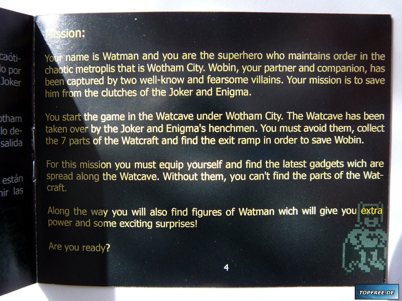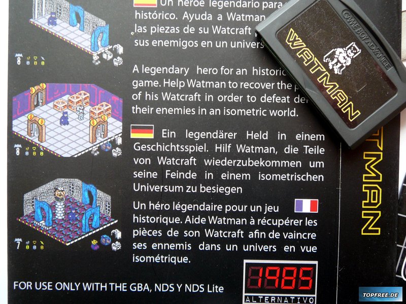 Na-na na-na na-na, na-na na-na na-na na-naaa… Wat-maaaaaaan! Neue Spiele für alte Konsolen? Gibt’s das? Klar! Sogar für den Gameboy Advance! Watman ist das wohl aktuellste Spiel im GBA-Modul. „1985 Alternativo“ aus Spanien hat das Batman-artige Spiel – Watman ist ein Remake von Batman für den Sinclair Spectrum – ins Modul gepresst und herausgebracht. Mittlerweile ist das Geschicklichkeitspiel in der 2D-Iso-Darstellung nicht mehr erhältlich. Ich habe wohl eines der letzten Exemplare ergattert.