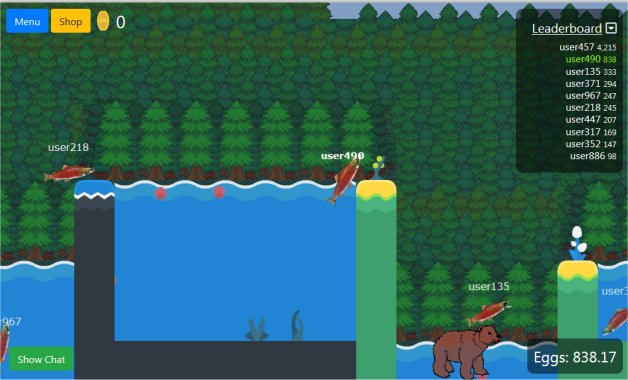 In diesem neuen IO-Spiel steuert man einen Lachs. In einer Grafik, die von Kinderhand gemalt sein könnte. Sieht nicht nur komisch aus, ist es auch. Denn außer mit der Maus deinen Lachs zu bewegen und mit der Maustaste zu springen, kannst du in diesem Multiplayer-Onlinespiel nichts machen. Dennoch bleibt ein Ziel: Die Rangliste zu erobern und nicht von Vögeln und Bären gefressen zu werden. Denn man kann aus dem Wasser springen, um dann in einem neuen Teich zu landen.
