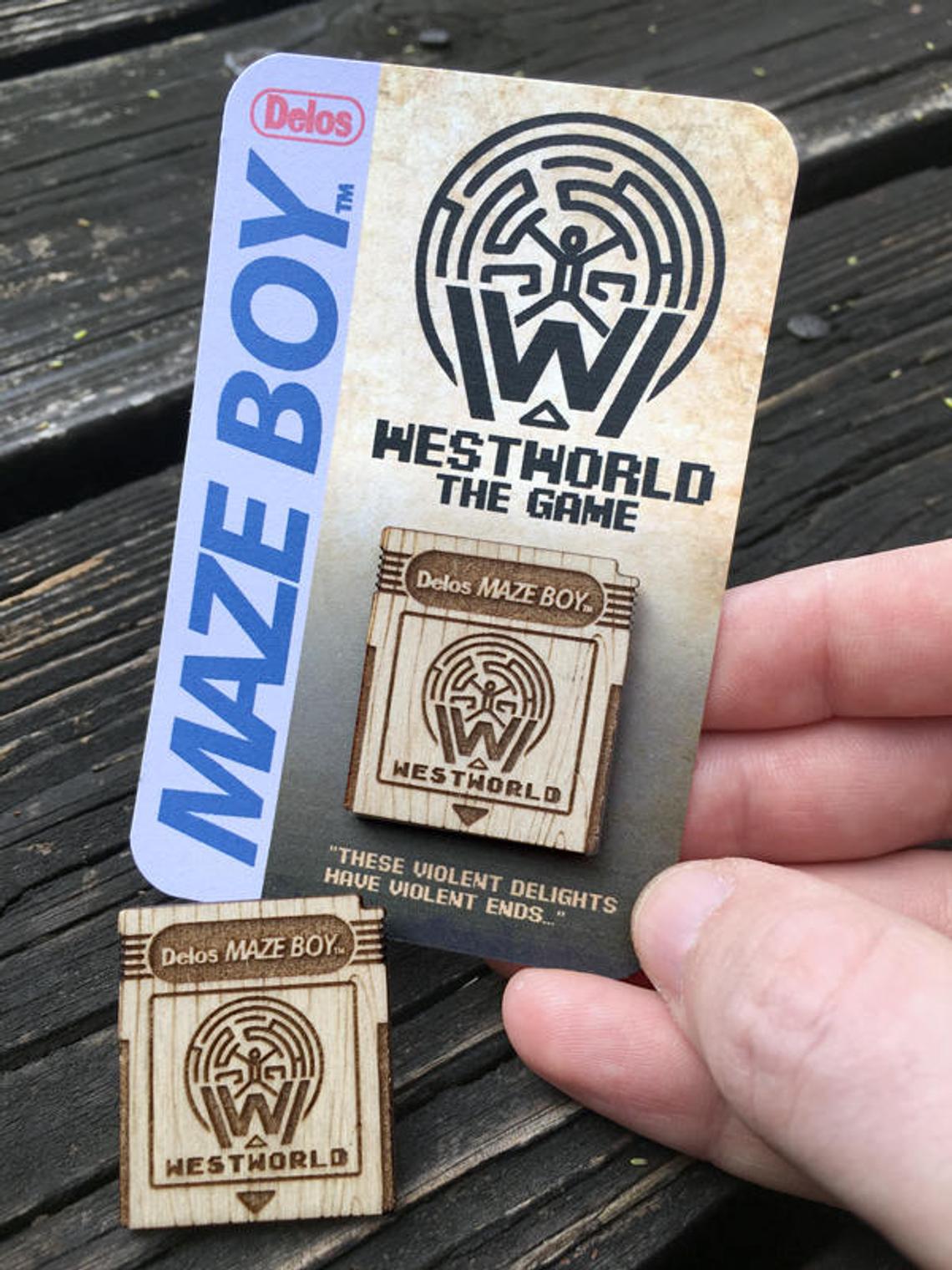 Das Holz-Modul gibt es über die Plattform Etsy, der Quasi-Nachfolger von Dawanda für Bastler und Künstler, unter diesem Link: https://www.etsy.com/de/listing/596553189/westworld-pin-delos-maze-boy-patrone