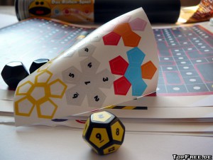 Das Bekleben der Würfel erfordert ein wenig Fingerspitzengefühl. Die Anordnung ist jedoch einfach zu verstehen und wird wie aufgedruckt aufgetragen. Den mittigen Aufkleber abziehen, auf eine Stelle des Würfels kleben und die weiteren Farben bzw. Zahlen wie auf dem Klebeetikett anordnen. Aufgrund der recht kleinen Größe und meiner Ungeschicklichkeit kann das auch mal schief werden. Solange man aber nichts kreuz und quer klebt, ist alles wunderbar erkennbar. Im Gegenteil, ich finde es ein bisschen schief sogar schöner, denn daran sieht man, dass es selbstgemacht ist (oder eher, dass ich es nicht besser kann). Fertig? Fertig! Das war’s! Eins der 25 Spielbögen auf dem Tisch ausgerollt und es kann schon losgehen. Sollte sich das matte „Posterspielfeld“ wieder aufrollen, einfach mal entgegen der vorherigen Rollrichtung rollen und so bleibt es egal von welcher Seite gut auf dem Tisch oder einer sonstigen Unterlage liegen. Die Spielfelder sind nämlich beidseitig bedruckt, sodass standardmäßig bei 25 Spielbögen 50 Spiele möglich sind. Die „Magnet Edition“ lässt sich zudem am Kühlschrank oder sonstigen magnetischen Oberflächen spielen.