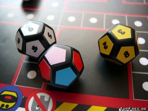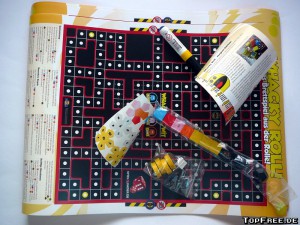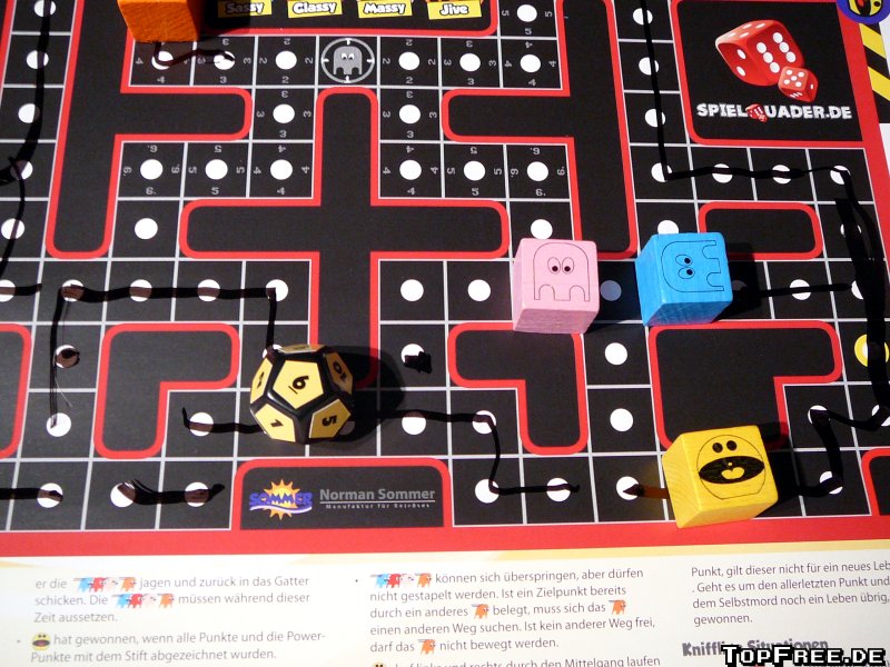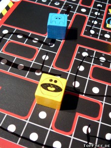 Die Regeln sind denkbar einfach und orientieren sich am original Pac-Man Computerspiel. Whacky würfelt mit seinem gelben Würfel und zieht die entsprechende Anzahl. Danach wird der Weg mit dem Permanent-Marker abgestrichen bzw. die Punkte, die auf dem Weg aufgesammelt wurden, durchgestrichen. Das Ziel ist natürlich alle Punkte einzusammeln. Die Monster – Sassy, Classy, Massy und Jive – werden vom anderen Mitspieler übernommen und haben zwei Würfel. Einen Farbwürfel, für die Farbe des jeweiligen Monsters das am Zug sein wird und einen eigenen, weiß beklebten, Zahlenwürfel. Bis zu zwölf Schritte kann Whacky machen, bis zu neun die Monster. Die Monster wollen Whacky natürlich aufhalten und ihn bei seiner Punktesammlung stoppen. Wer welche Figuren spielt, müsst ihr natürlich vorher unter euch ausmachen (nicht prügeln!).