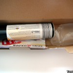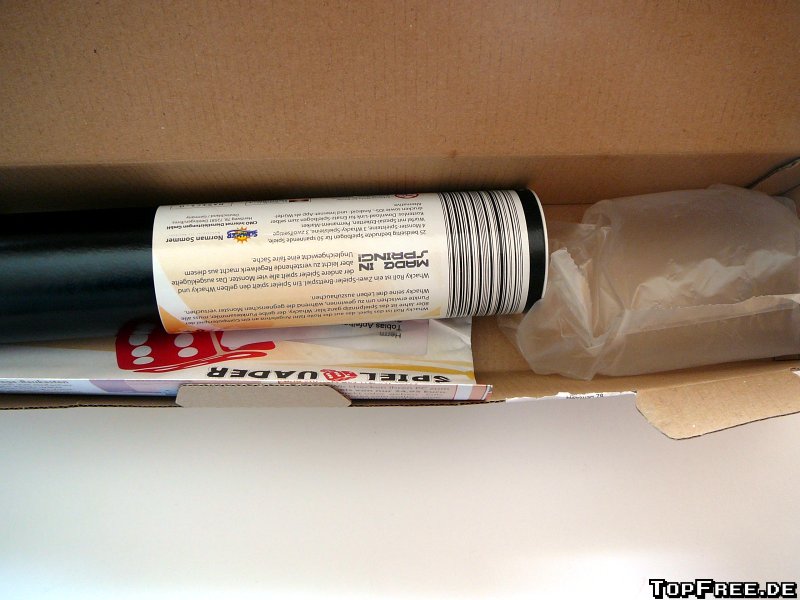 Gut verpackt, die Unterseite ist zugetackert, damit beim Tragen auch wirklich keine Monster herausfallen können, kommt nach dem Öffnen die schwarze Whacky-Rolle zum Vorschein (bisher noch ohne gefährliche Monster). In der Rolle (5 cm Durchmesser, 33 cm Länge) enthalten sind 25 beidseitig bedruckte Spielbögen in der nachgemessenen Größe von 42 x 29,5 cm für insgesamt 50 Spiele, vier Monster-Spielsteine, drei Whacky-Spielsteine – alle jeweils aus Buchenholz, drei zwölfseitige schwarze Plastik-Würfel mit den dazugehörigen Klebeetiketten, ein Permanent-Marker sowie die Anleitung in Deutsch, Englisch, Französisch und Spanisch. Alles aus der Rolle gezogen, geht es erstmal an die Vorbereitung, denn die schwarzen Würfel müssen zunächst noch beklebt werden.