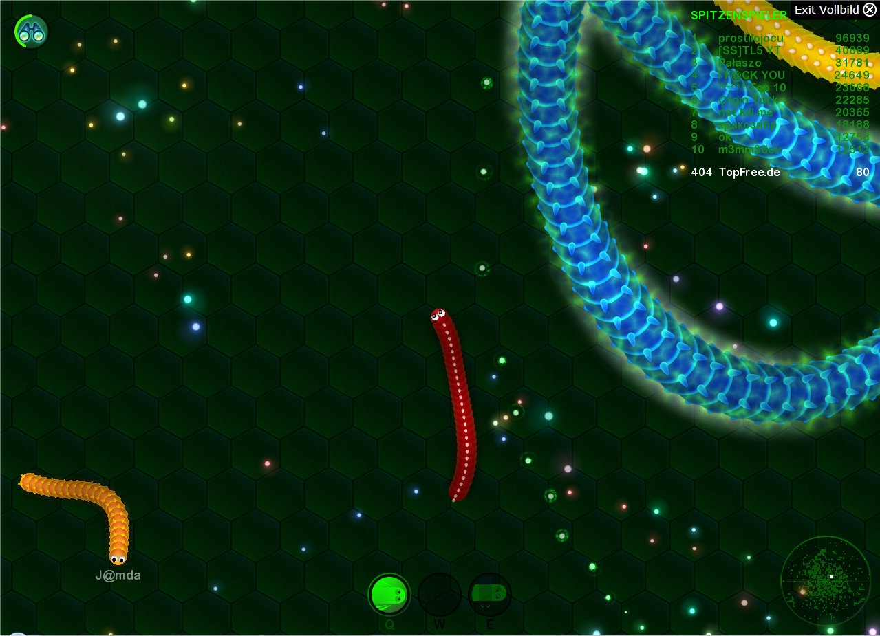 Gesteuert wird mit den Pfeiltasten oder der Maus. Das Besondere. „Q“ gibt einen Extra-Schub. Die Taste „W“ stoppt den Wurm für mehrere Sekunden und „E“ lässt deinen Wurm unsichtbar werden für eine kurze Zeit. Nicht alle taktischen Möglichkeiten stehen jederzeit zur Verfügung, deswegen ist die Benutzung sorgfältig zu wählen. Das Stoppen ermöglicht zum Beispiel Würmer die einen verfolgen, in sich hineinfahren zu lassen. Zack, berührt und weg. Das ist auch der Punkt, berührt man einen anderen Wurm, verschwindet man. Dafür gibt es dann die Taste „E“ mit dem Geist-Modus.