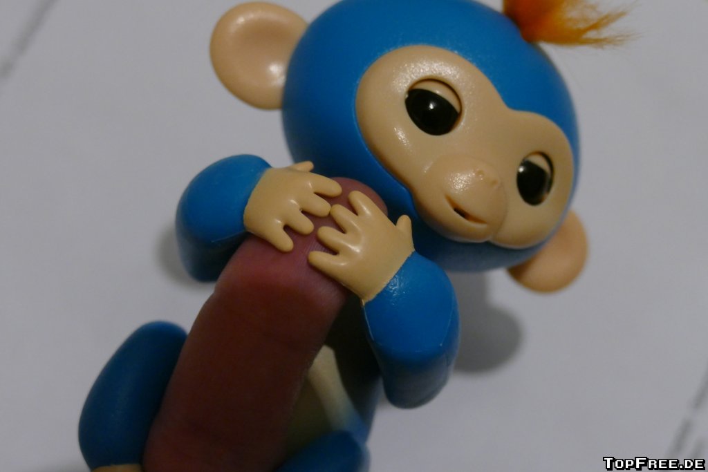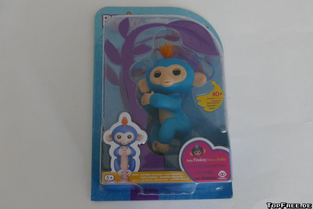 Entschieden habe ich mich für Boris, dem blauen Babyäffchen. Über 40 Geräusche soll der Kleine machen können und bewegt dazu seinen Kopf und die Augenlieder. Vorgestellt hatte ich ihn mir etwas kleiner, tatsächlich aber misst er von Hand gemessen ungefähr 12 x 5 x 8 cm. Kleine Kinderfinger müssten da doch schon ihre Probleme mit haben und besonders leicht finde ich ihn auch nicht. Ehrlich gesagt hatte ich auch tatsächlich gedacht, dass der kleine Affe Arme und Beine ein wenig bewegen kann und dadurch den Finger einschließt. Allerdings sind Arme und Beine starr und aus einem harten Gummi, aus dem auch der Schwanz besteht. Der Rest ist Plastik – bis auf die orangenen Härchen.
