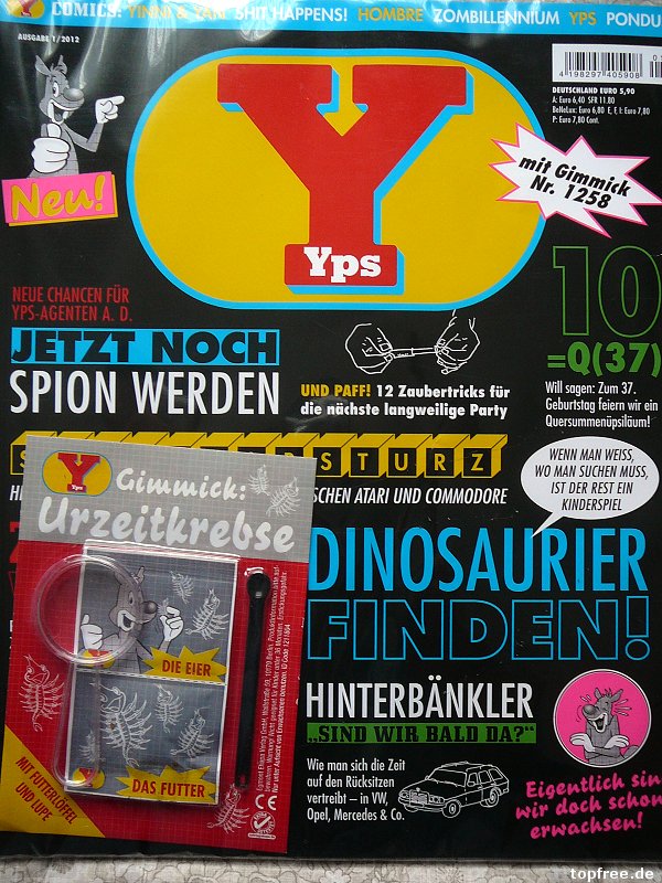 Fazit: 5,90 Euro für ein Yps-Magazin, das versucht erwachsen zu wirken. Dass die Auflage von 120.000 Exemplaren sofort vergriffen war, spricht dafür, dass das Yps immer noch bekannt und beliebt ist. An der Umsetzung hapert es aber noch. Der Versuch vor einigen Jahren das Magazin im früheren Stil herauszubringen, ging in die Hose, u.a. auch wegen der lieblosen Gimmicks. Die Urzeitkrebse sind zwar jetzt nicht sonderlich innovativ, man darf aber gespannt sein, was einen in Ausgabe 1259 zum Preis von immerhin 5,90 Euro erwartet. Hier liegt auch das Problem, viel Geld, viel Werbung, wenig wirklich interessante Artikel. Zum Durchstöbern ganz nett, mehr als einmal in jeden Artikel schaut man aber dann doch eher selten rein. Mehr von den alten Comics wären für kommende Ausgaben mehr als gut.