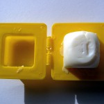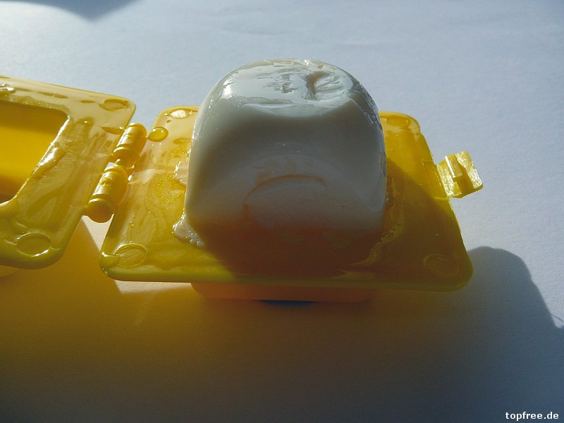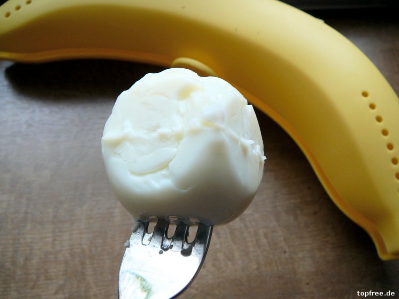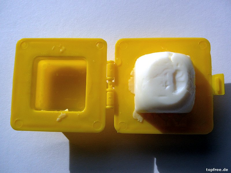 Was bleibt ist das Gimmick. Eine Spielerei. Ei kochen, heiß ins Gimmick, zuschließen und ab in den Kühlschrank. Nach ein paar Stunden kann man das abgekühlte Ei herausnehmen. So perfekt viereckig wie im Heft abgebildet war es bei mir nicht, aber immerhin (siehe Bilder unten). Ein netter Gag zu Ostern.