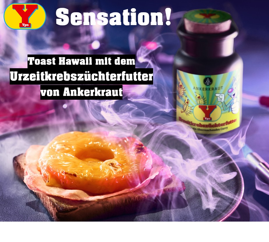 „Pünktlich zum 50-jährigen Jubiläum von Yps hat Ankerkraut das Urzeitkrebszüchterfutter herausgebracht – für Gimmick-Fans von damals und heute: Gibt dem Essen nicht nur Würze, sondern auch Farbe!“, teilt die Marke Yps heute in den Sozialen Medien mit und hat direkt eine passende Grafik (siehe oben) dazu mitgebracht.