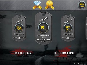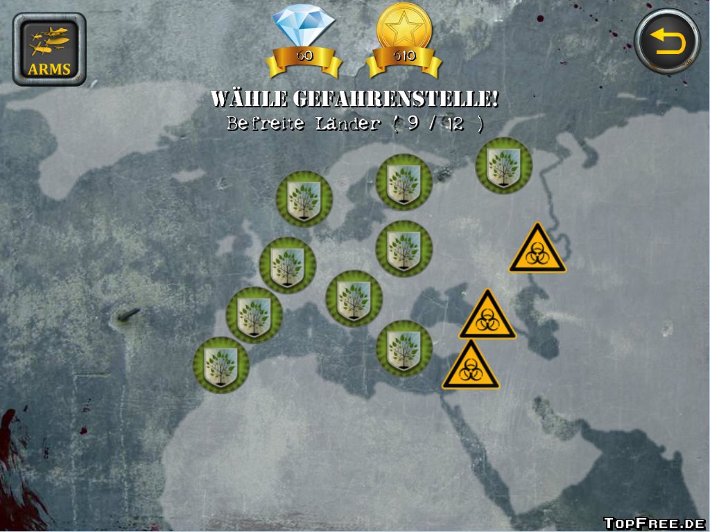 Mit einem Klick auf „Spielen“ geht es dann los. Nordamerika, Europa, Asien, Südamerika, Afrika, Australien und die Antarktis gilt es von den Zombies zu befreien. Die Antarktis bietet nur ein Level, eine Art Endlosmodus, wohingegen bei allen anderen Kontinenten verschiedene Länder als „Gefahrenstelle“ gerettet werden sollen. Für die Ausrüstung kann unter dem Button „Arms“ nachgerüstet werden. Dabei findet der Kampf aus der Luft statt. Raketen, Doppeldecker, Helikopter und andere Luftwaffen stehen zur Verfügung, die teilweise noch aufgerüstet werden können. Insgesamt gibt es nur 11 Waffenarten. Übersetzt wurde zudem nicht alles, denn „Cooldown“ bedeutet hier soviel wie die Zeit in der die Waffe wieder zur Verfügung steht. Bezahlt wird mit Diamanten oder goldenen Talern, die es nach einer erfolgreichen Mission als Belohnung gibt. Etwas nervig ist der Wechsel zwischen den Waffenarten. Es hakt.