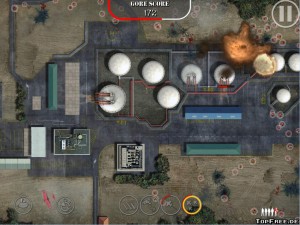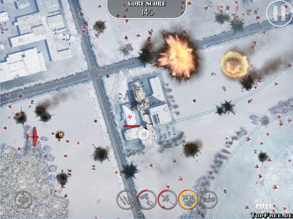 Das eigentliche Spielprinzip ist simpel: Unten wird die Liste der verfügbaren Waffen aufgezeigt. Ein Klick darauf aktiviert die Waffe, ein weiterer Klick auf das Spielfeld lässt sie abfeuern. Je nach Waffenart fliegt dann ein Flugzeug über das Feld und beschießt die angeklickte Stelle. Zudem gibt es noch Extrawaffen, wie ein Sumpf oder auch ein Zeitlupenmodus, die sich sich mittels der angesprochenen Taler für eine Mission freischalten lassen. Von allen Seiten trudeln dann die Zombies ein und gehen schnurstracks auf das jeweilige Zielgebäude, das mit einem roten Lebensbalken gekennzeichnet ist, zu. Das Ziel ist es natürlich die Zombiehorden aufzuhalten. Oben läuft ein Zeitbalken ab, in dieser Zeit muss man es schaffen, die Zombies vom Zerstörken des Hauptgebäudes abzuhalten. Zum Ende der Zeit ist teilweise der ganze Bildschirm voll mit Zombies, ziemlich hektisch! Sowieso gestaltet sich das Gameplay als recht hektisch. Als „action-injizierter Tower Defense-Manier“ auf der Rückseite der Verpackung angepriesen, ist das hier eher ein „ich klicke schnell die Waffe an die verfügbar ist-Spiel“. Denn die Waffenarten benötigen einige Zeit um sich wieder aufzuladen, bis auf beispielsweise Minen, die nur in einer begrenzten Anzahl zur Verfügung stehen. Doch viel Taktik gibt es nicht, das Ziel ist es einfach immer, mit den zur Auswahl stehenden Waffenarten die Zombies zu vernichten. Dabei benutzt man tatsächlich einfach die, die es gerade gibt. Denn irgendwann ist bei einigen Leveln der Bildschirm so voller Zombies, dass zum Aussuchen der Waffe gar keine Zeit mehr bleibt. Klick, klick, klick,… Blöd auch, wenn die Zombies direkt unter dem Waffenknopf herlaufen und man dort gar nicht schießen kann.
